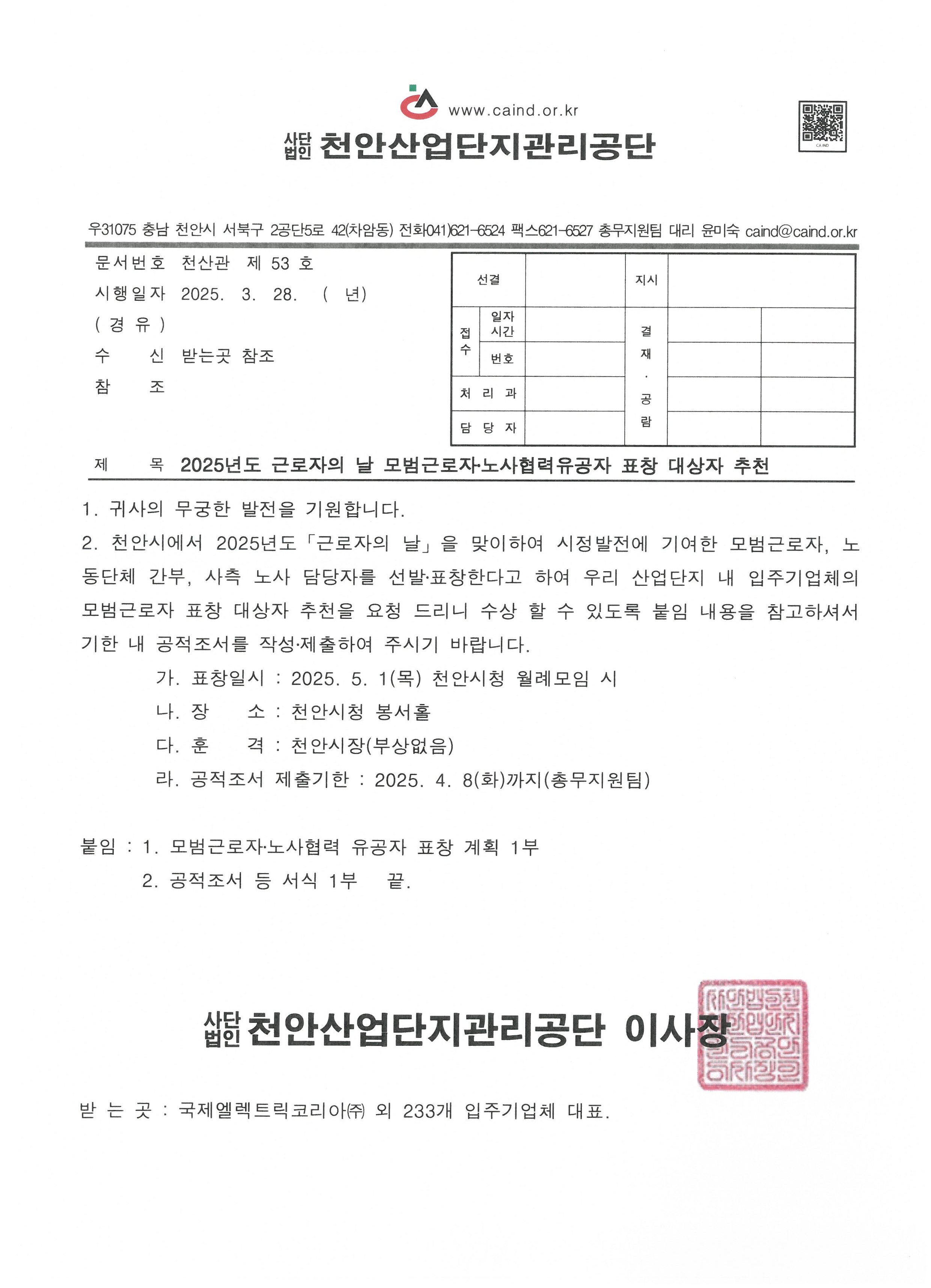 제목 2025년도 근로자의 날 모범근로자·노사협력유공자 표창 대상자 추천