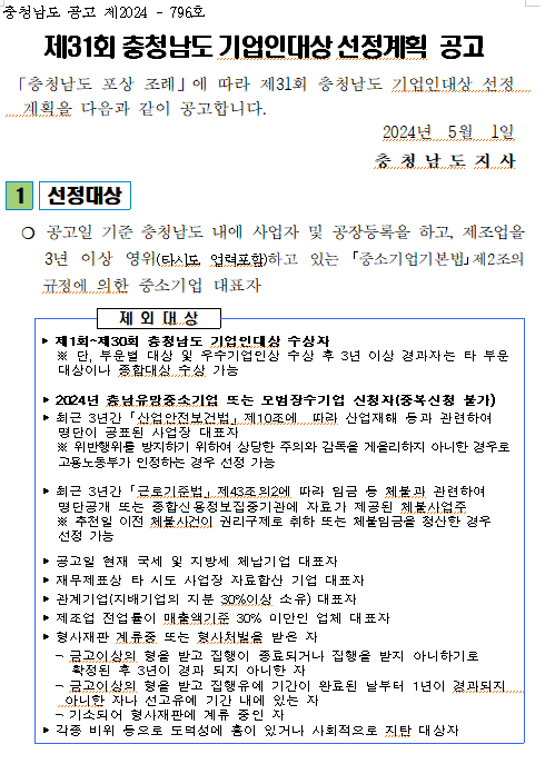 제목 제31회 충청남도 기업인대상 선정계획 공고